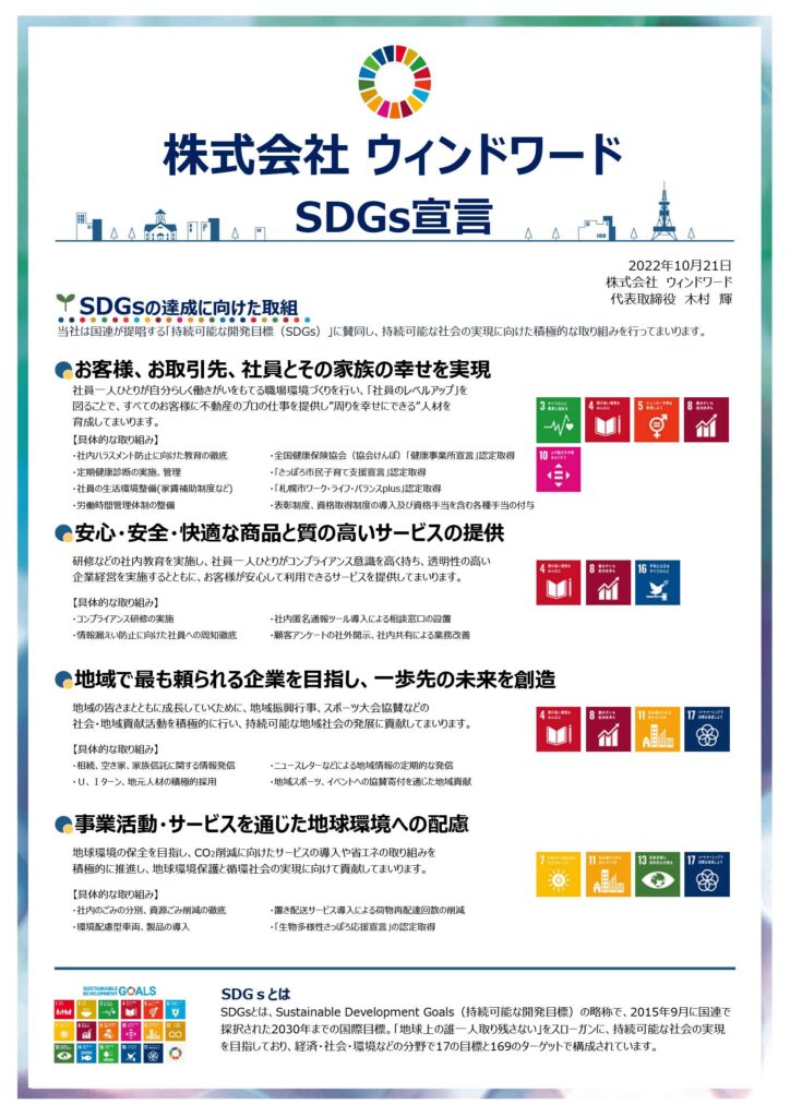 私たちウィンドワードは、不動産業を通じて「住み続けられるまちづくり」だけではなく、社員が働きやすい環境の整備、地域貢献など持続可能な社会の実現に向けた取り組みを積極的に推進してまいります。