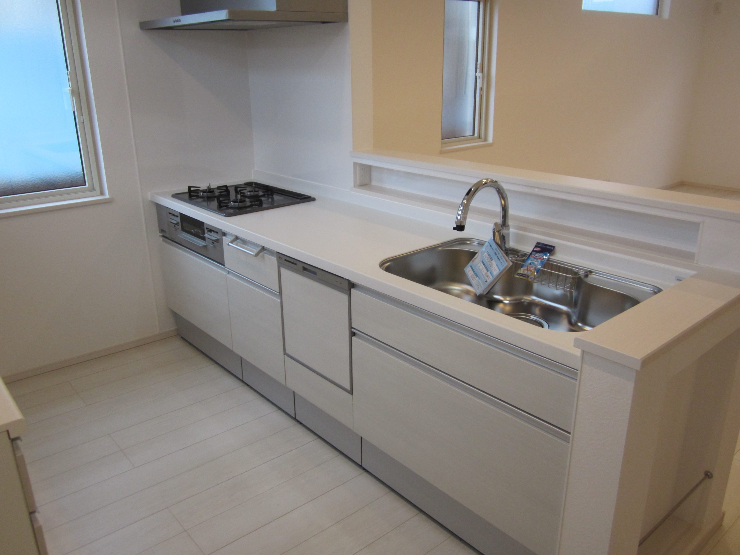 - 一坪バス、追い炊き機能、トイレ2か所、タンクレストイレ、温水洗浄便座、シャワー付き洗面化粧台、2口以上コンロ、システムキッチン、食器洗浄機、ウォークインクローゼット、ダウンライト、照明器具、フットライト