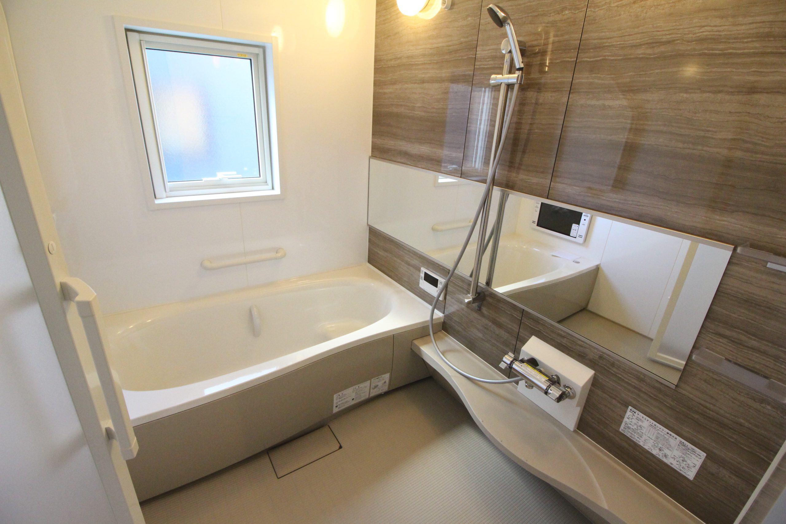 - 一坪バス、追い炊き機能、トイレ2か所、浴室乾燥機、食器洗浄機、温水洗浄便座、シャワー付き洗面化粧台、2口以上コンロ、システムキッチン、ダウンライト、照明器具